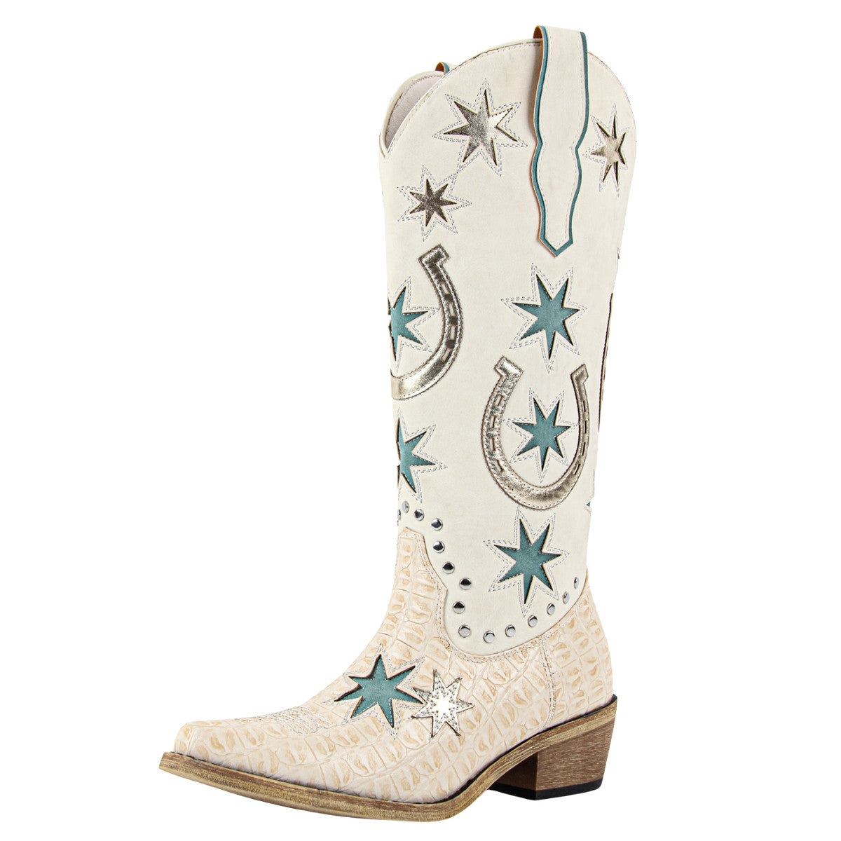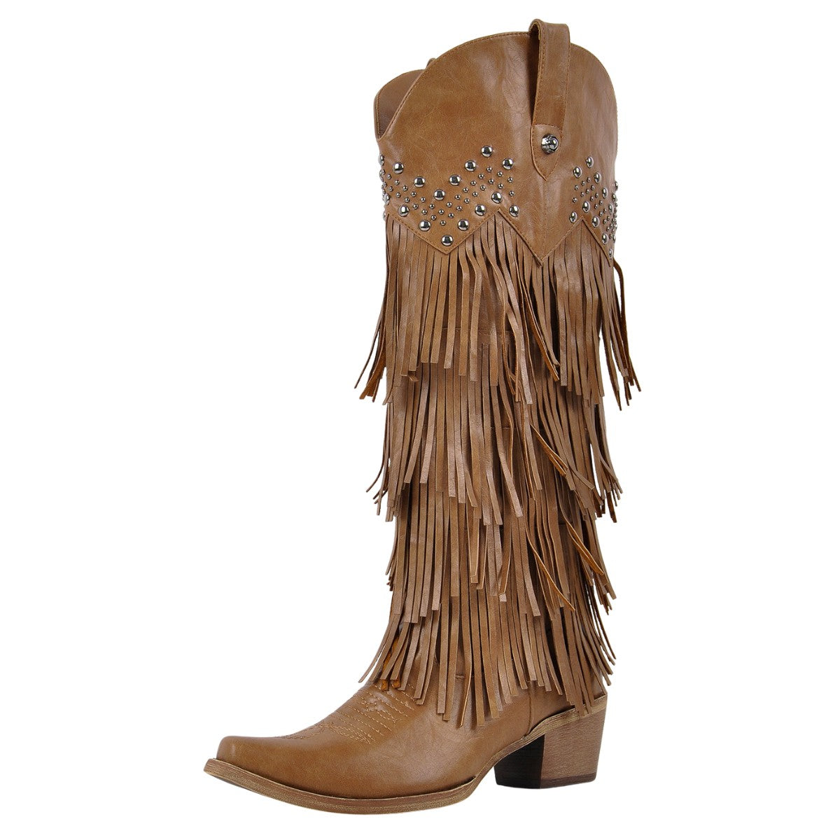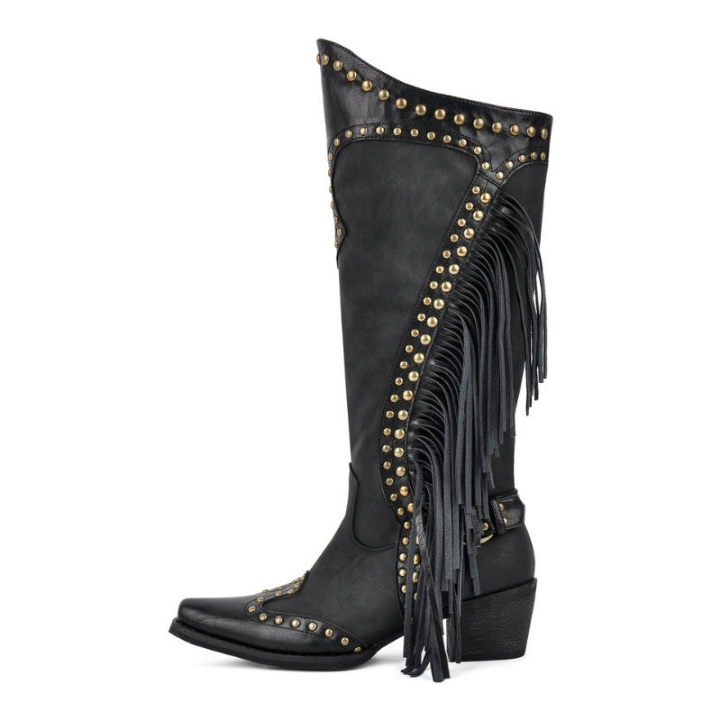 Pointed Toe Rivet Fringe Knee High Western Boots$99.99 USD$119.99 USD