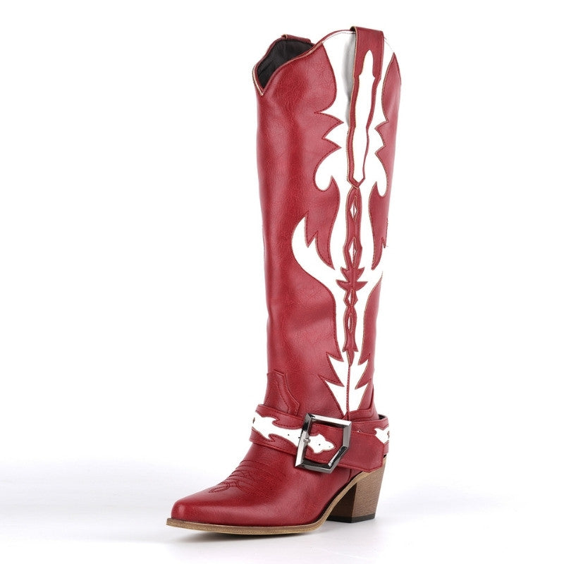 Pointed Toe Buckle Strap Knee High Western Boots
