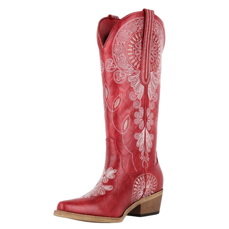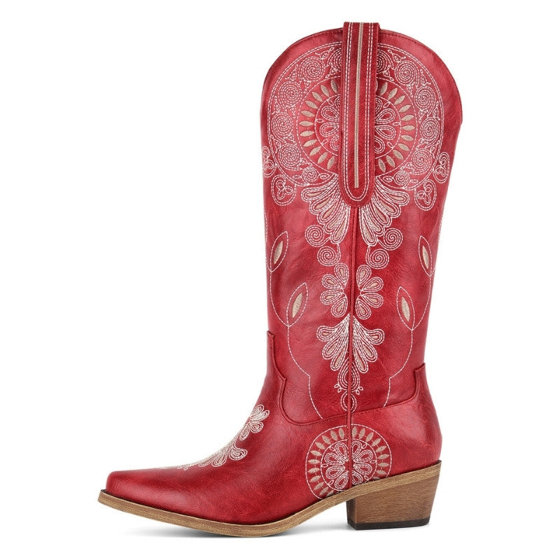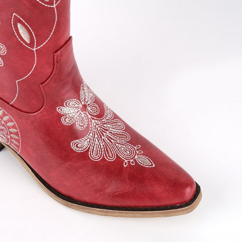 Embroidery Chunky Heel Mid-Calf Western Boots