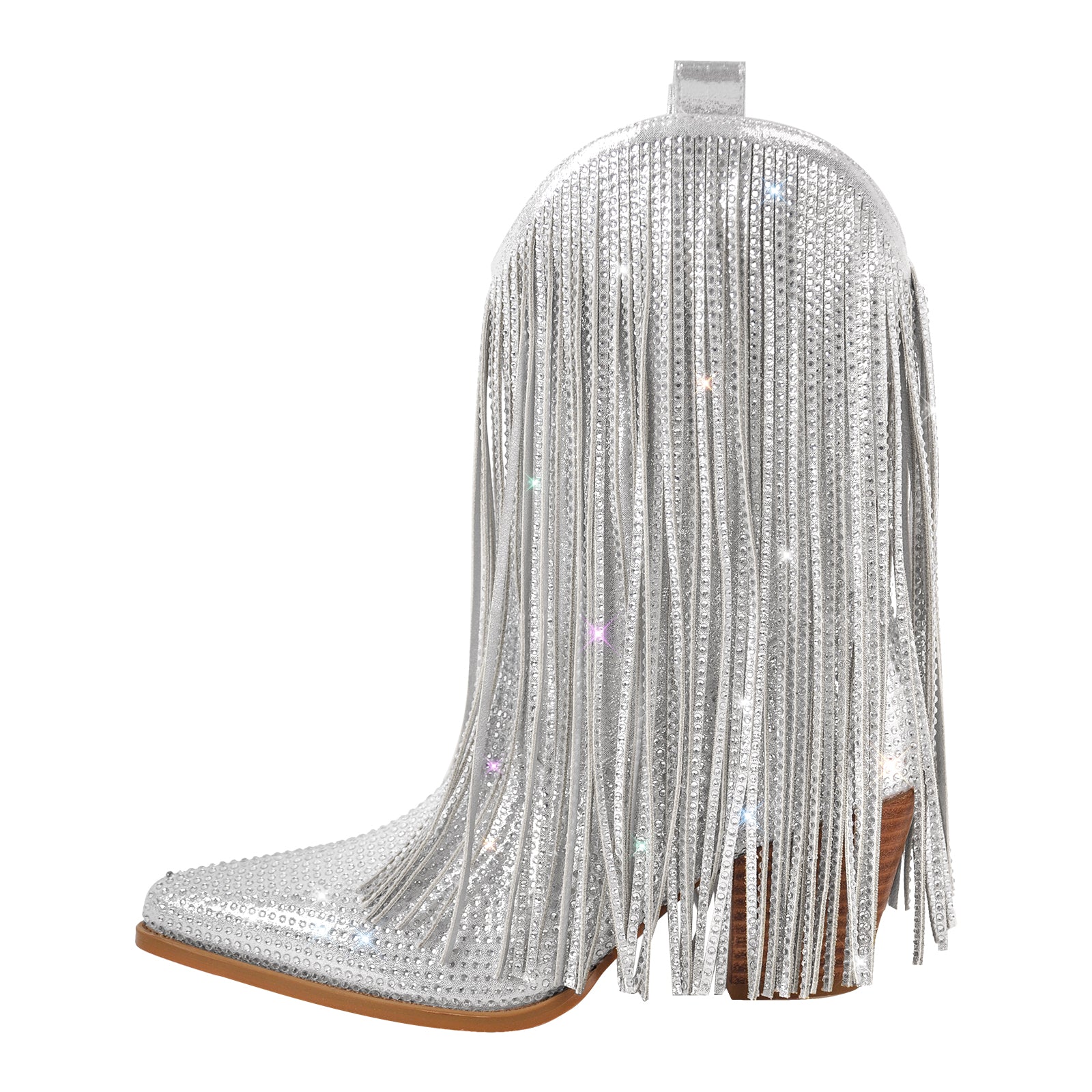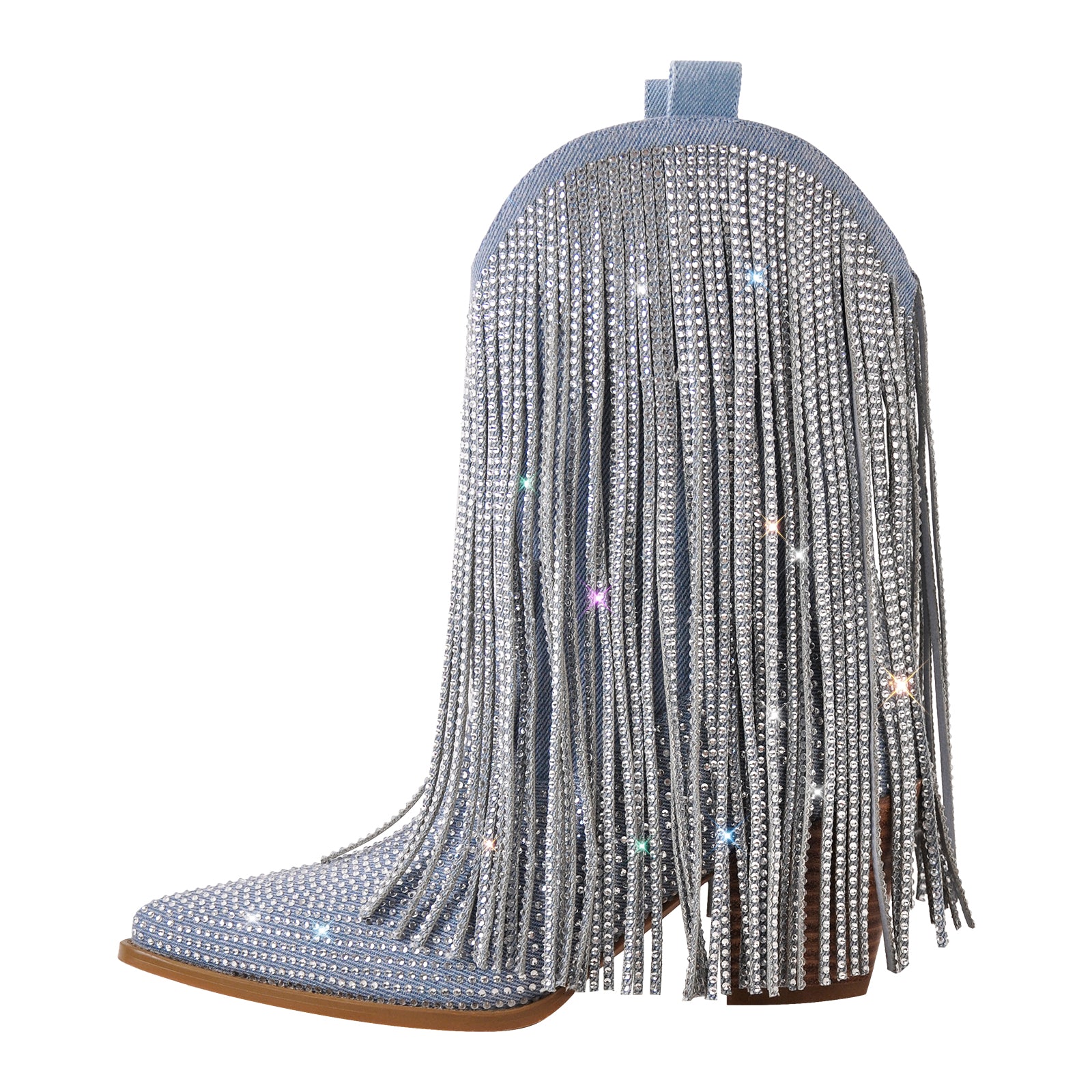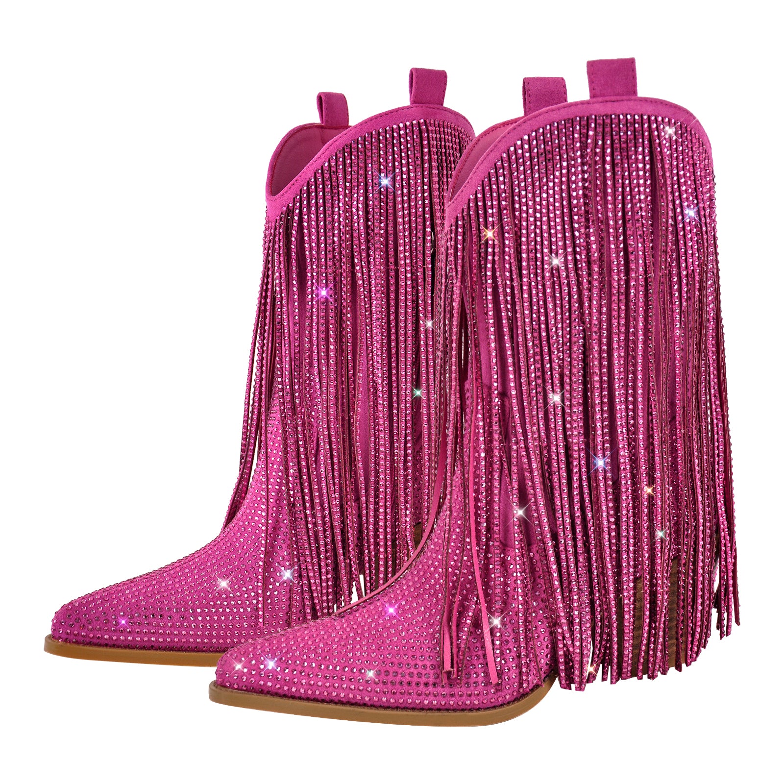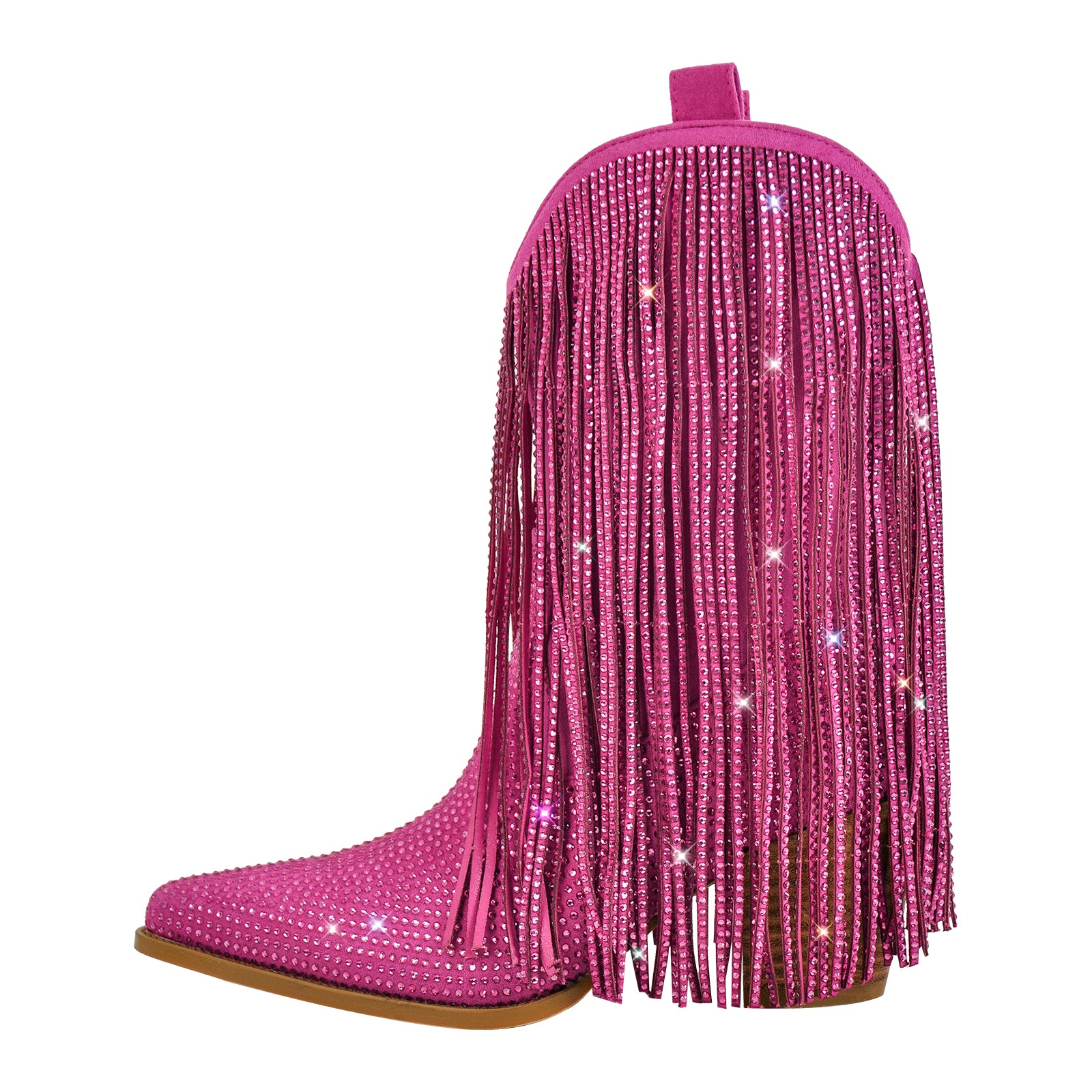 Rhinestone Pointed Toe Fringe Mid-Calf Western Boots