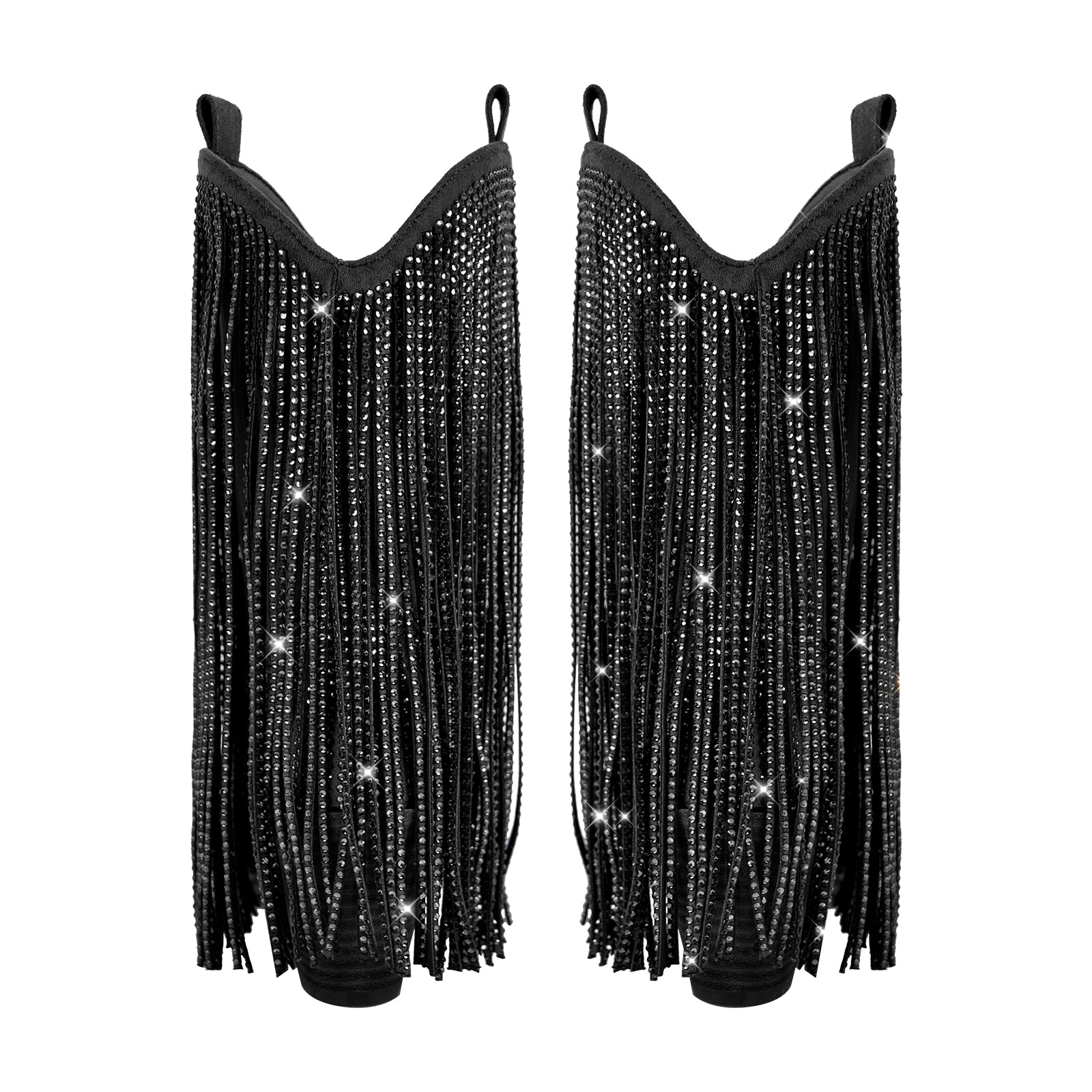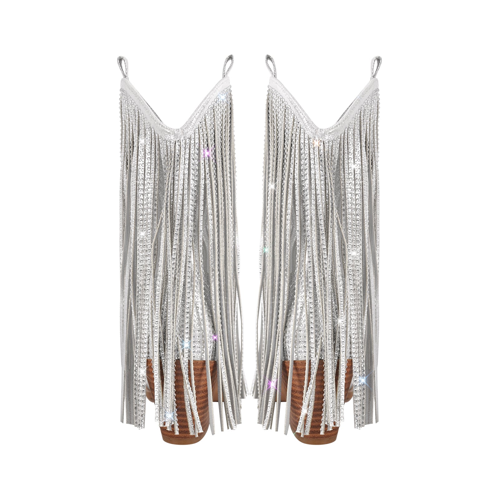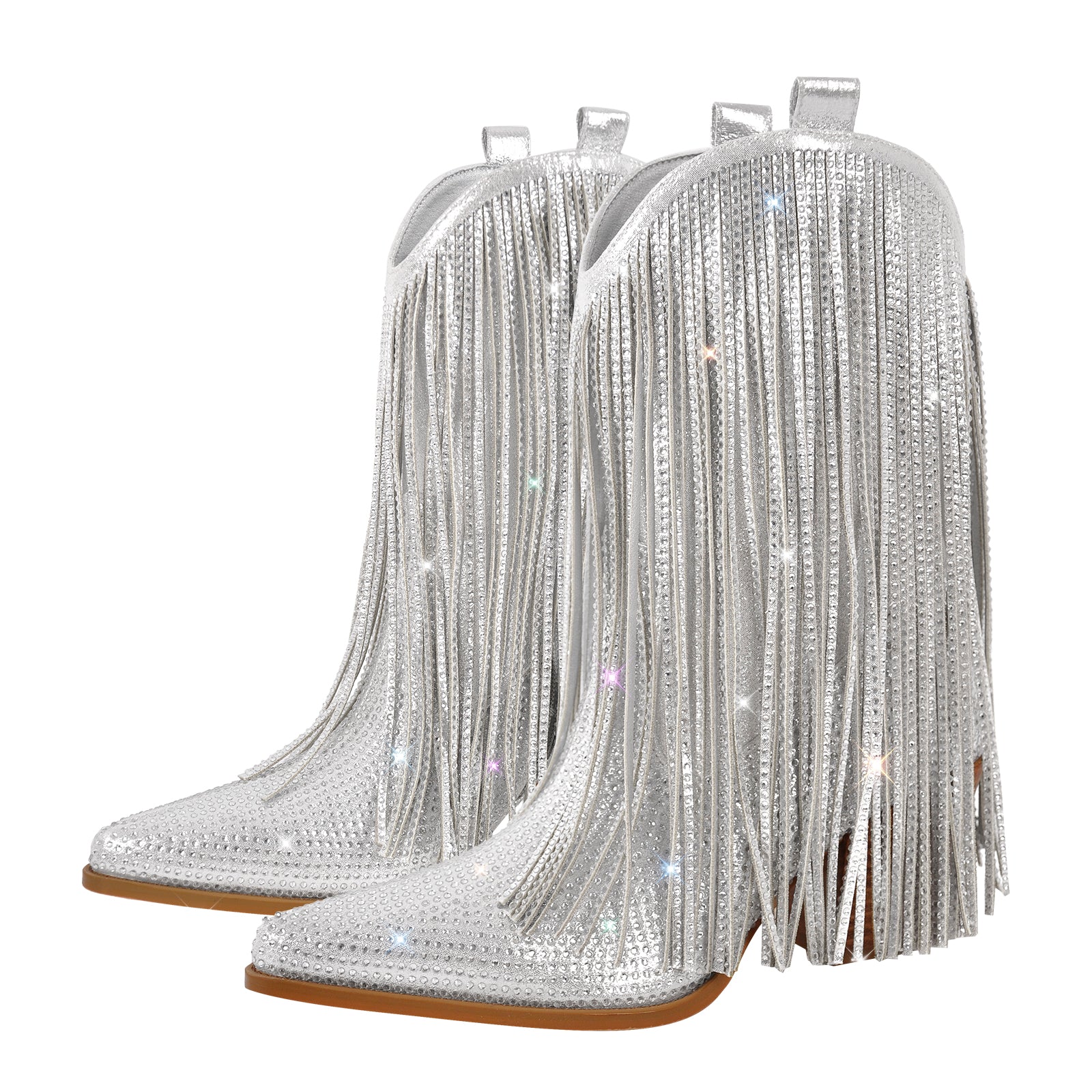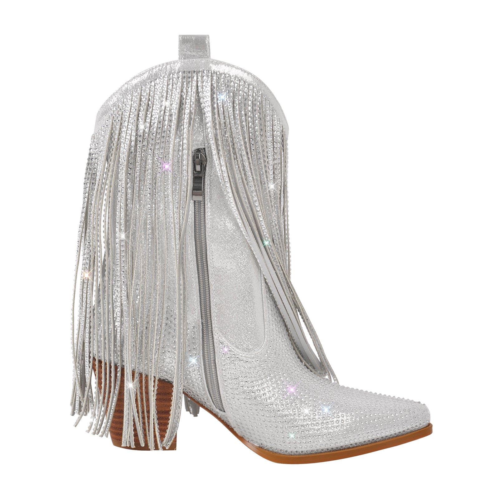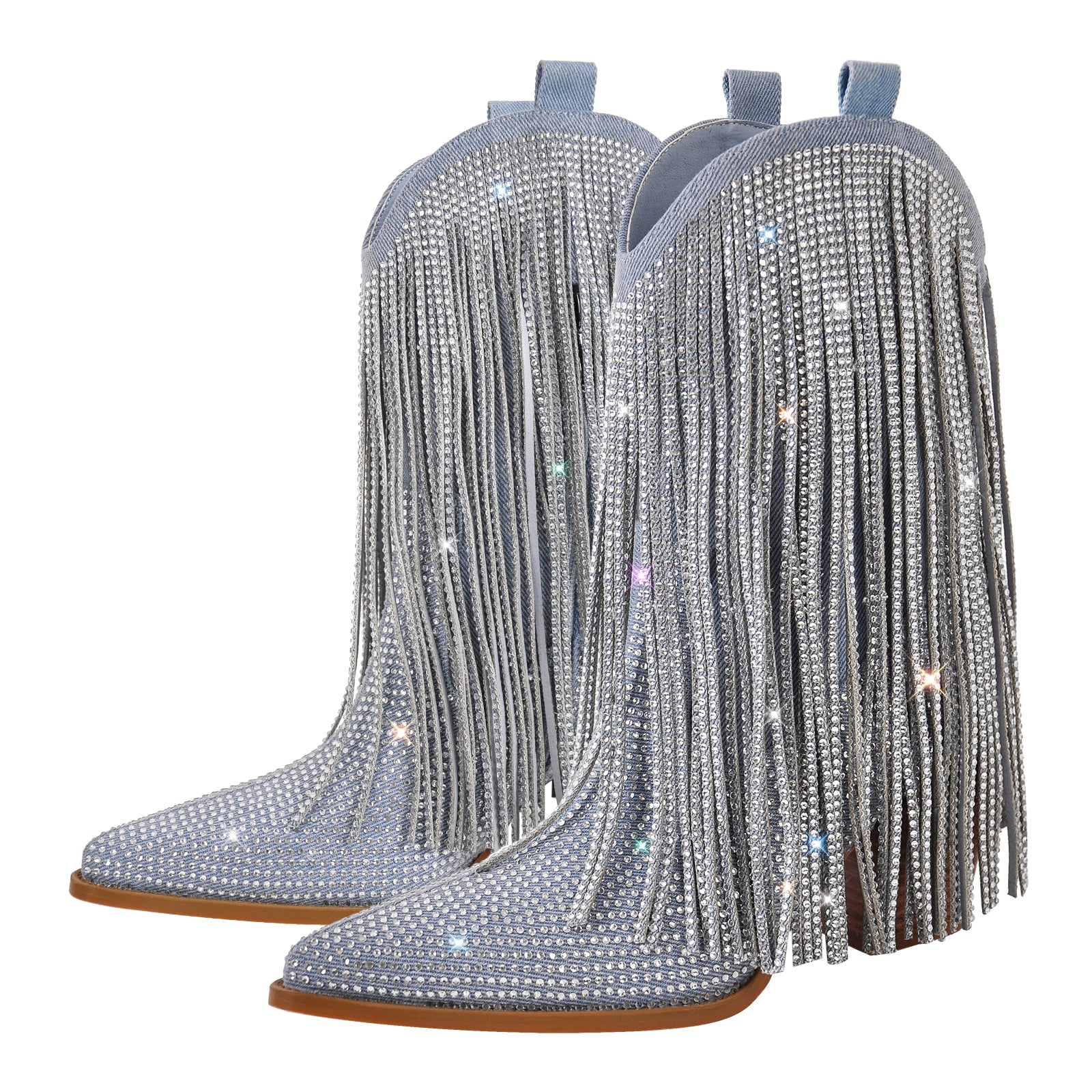 Rhinestone Pointed Toe Fringe Mid-Calf Western Boots