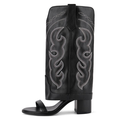 Embroidery Chunky Heel Mid-Calf Bootie Sandals