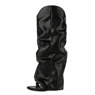 Fold Over Pointed Toe Wedge Heel Knee High Boots