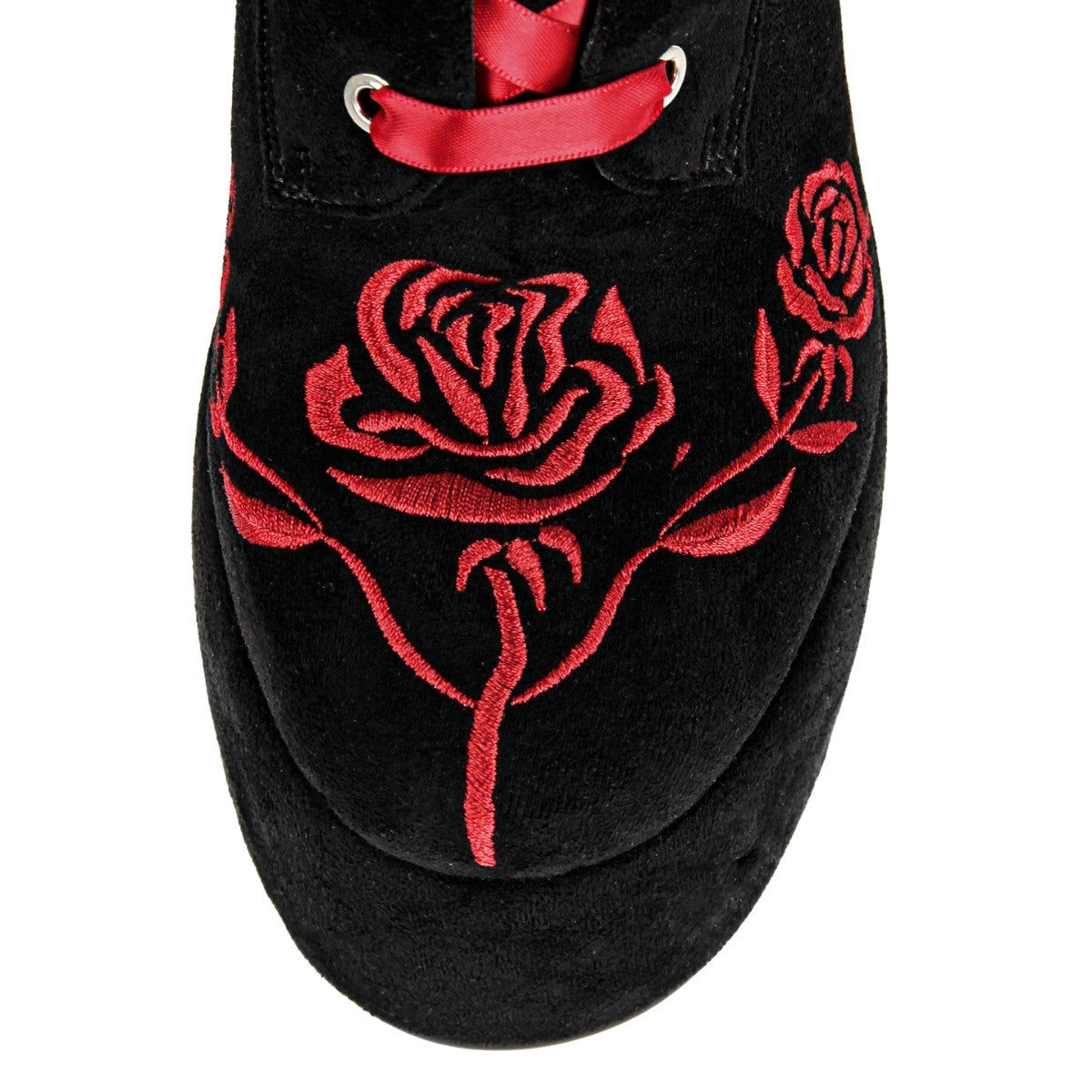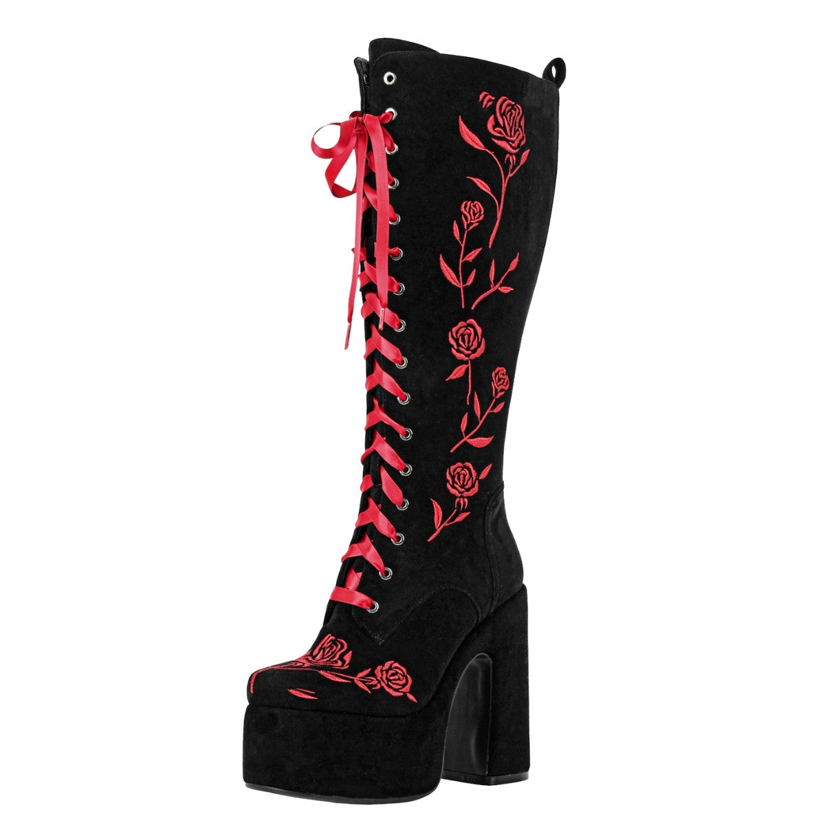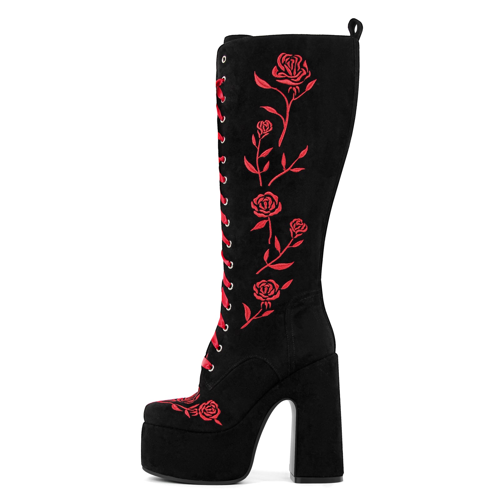 Suede Platform Floral Embroidery Lace-up Knee High Boots