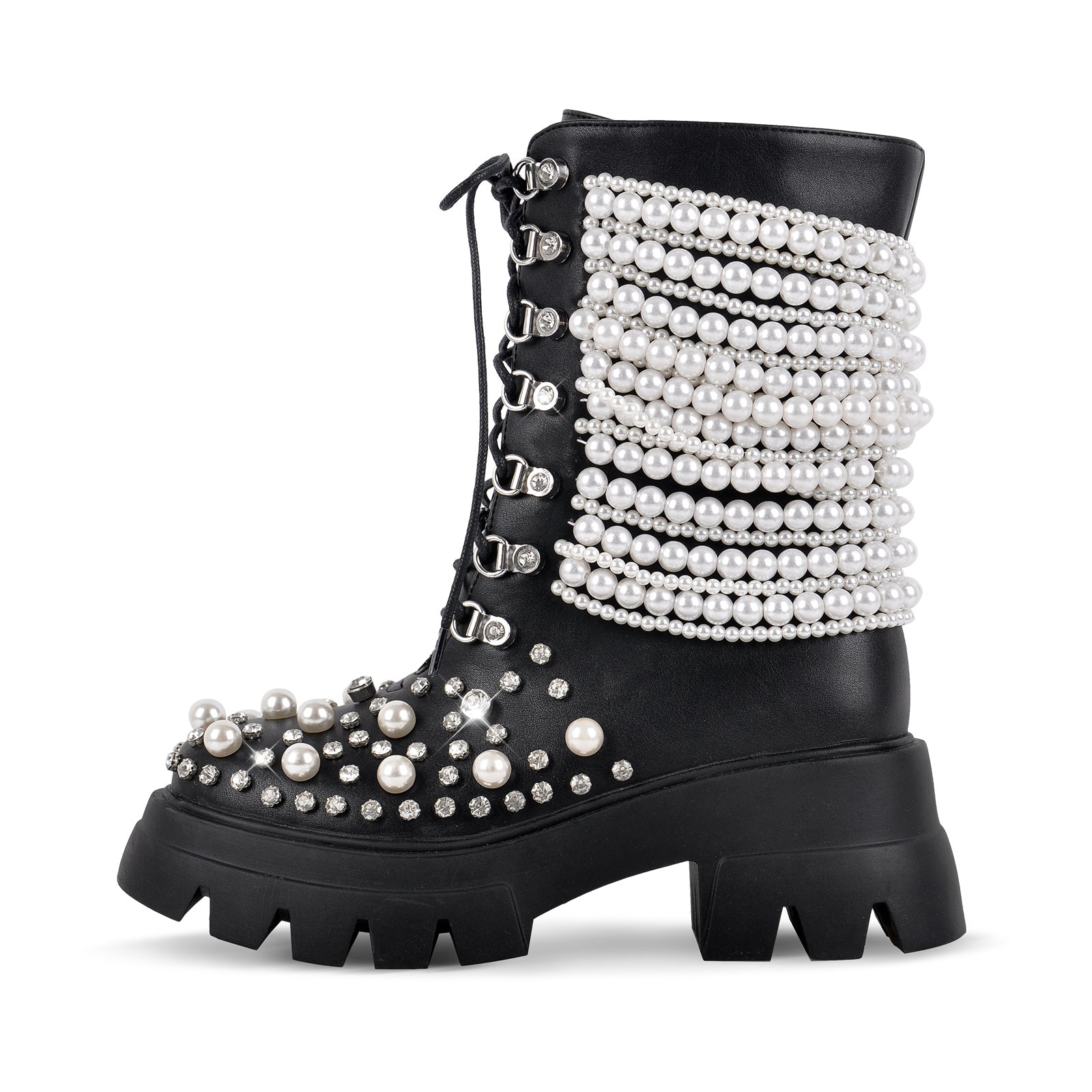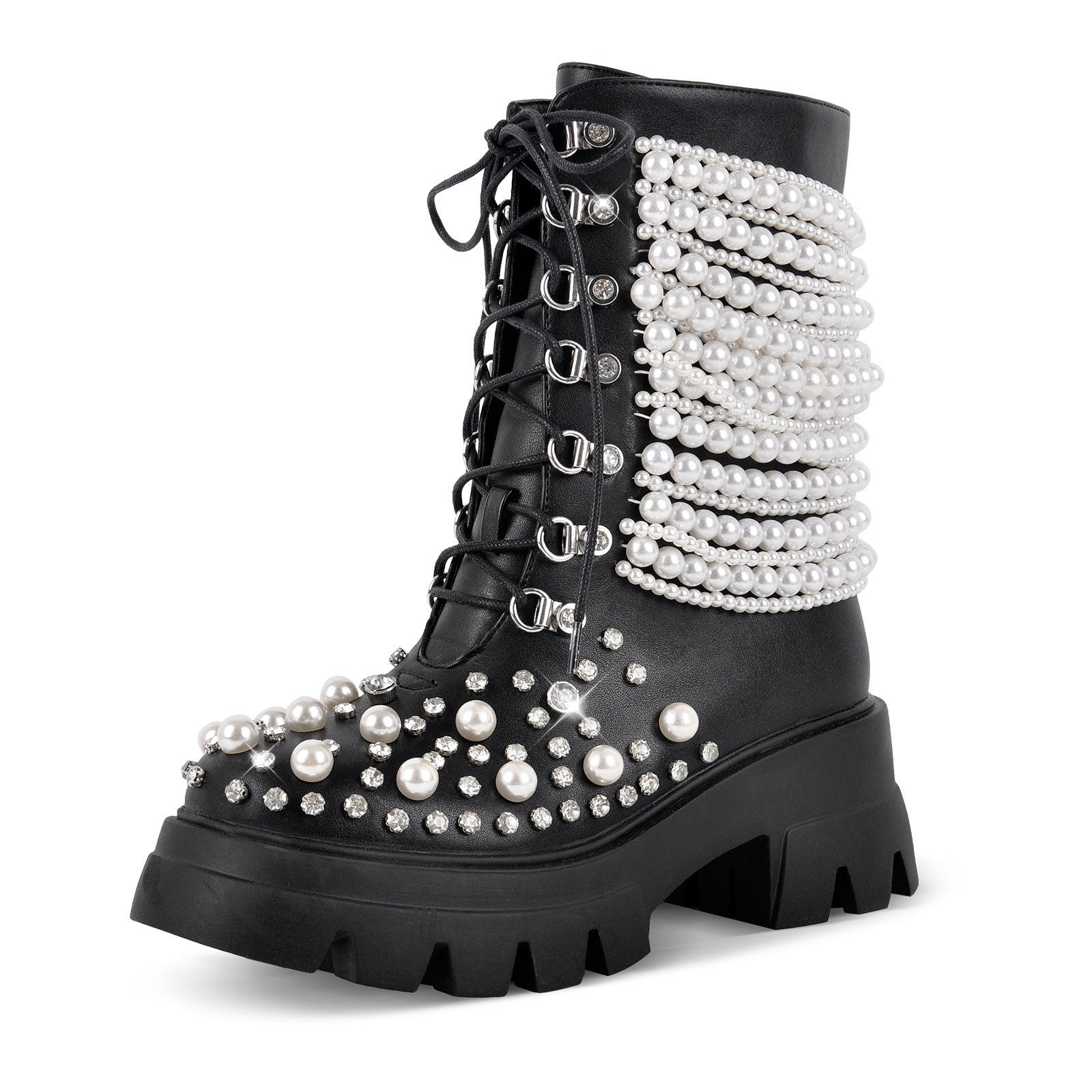 Pearl Rhinestone Embellished Platform Ankle Boots$89.99 USD$129.99 USD