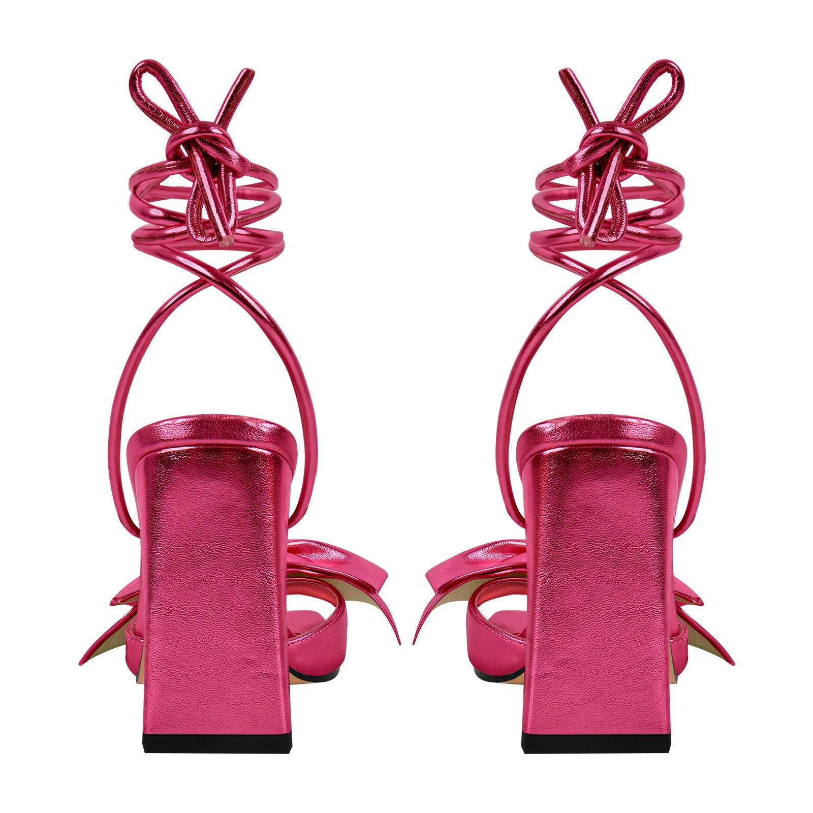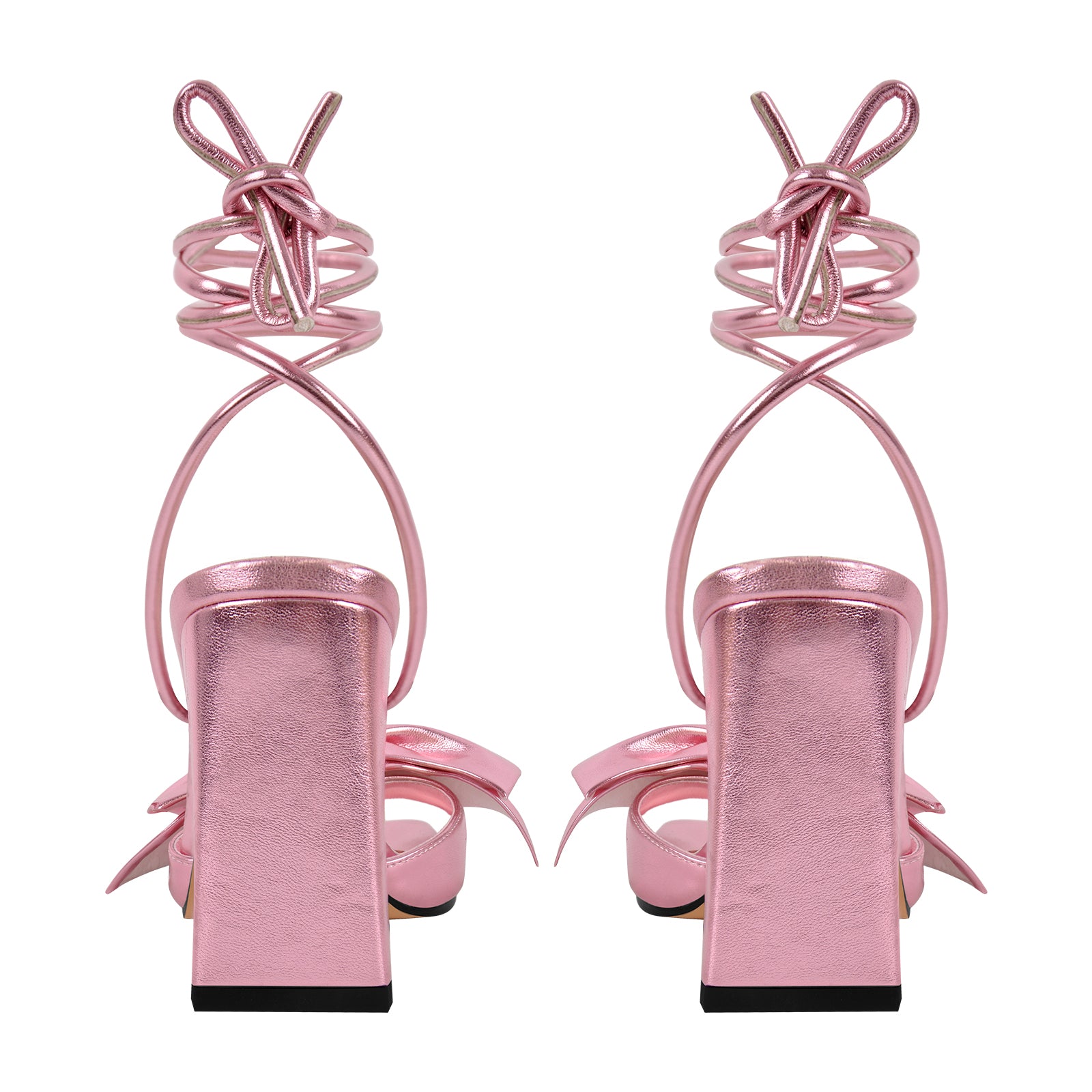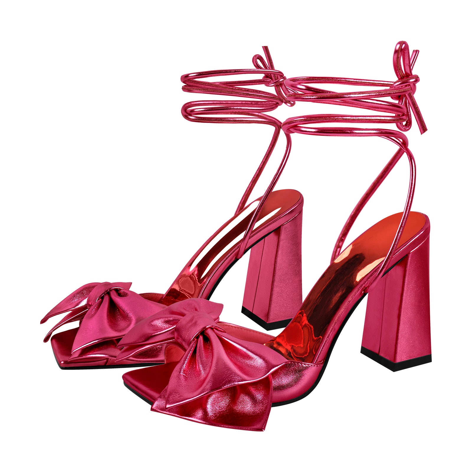 Bow Lace Up Square Toe Chunky Heel Sandals