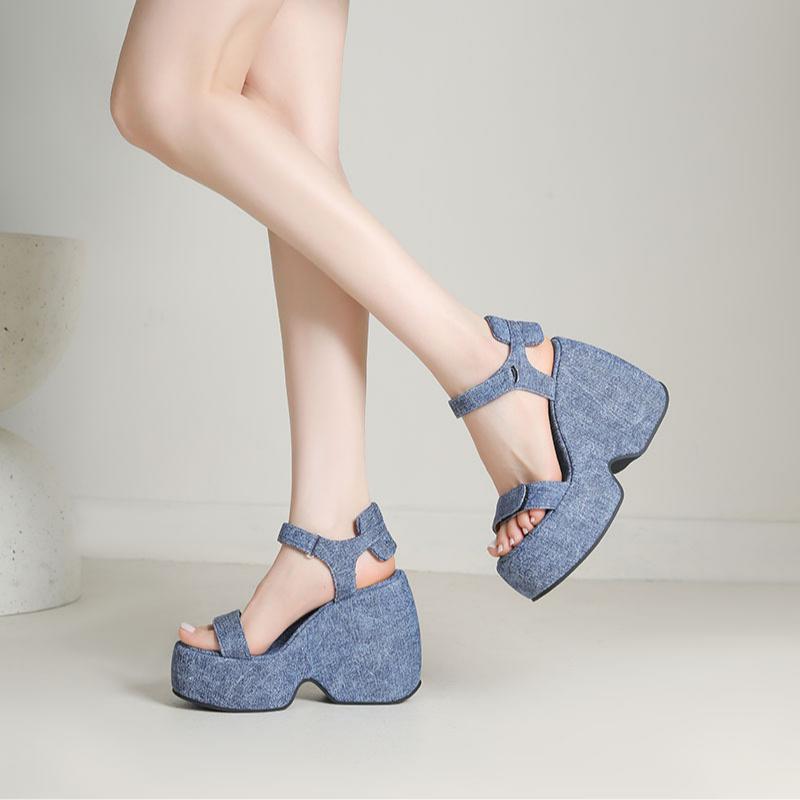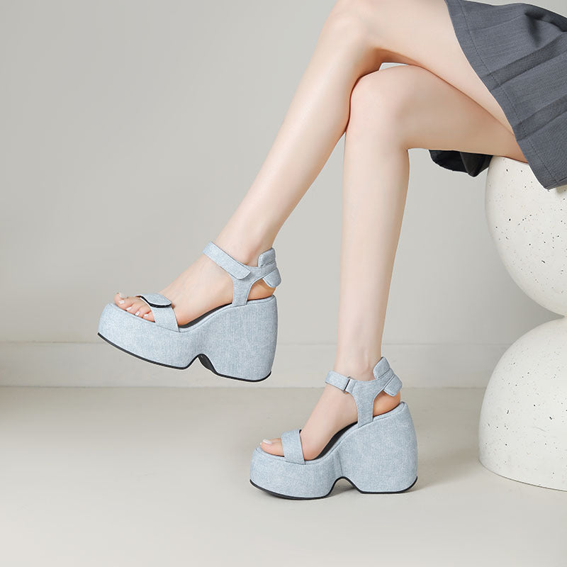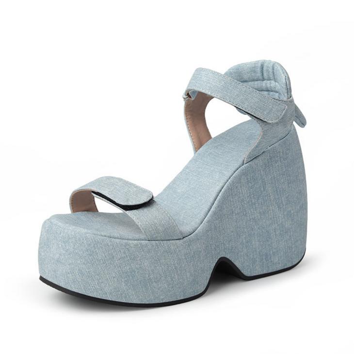Denim Platform Velcro Strap Wedge Heel Sandals